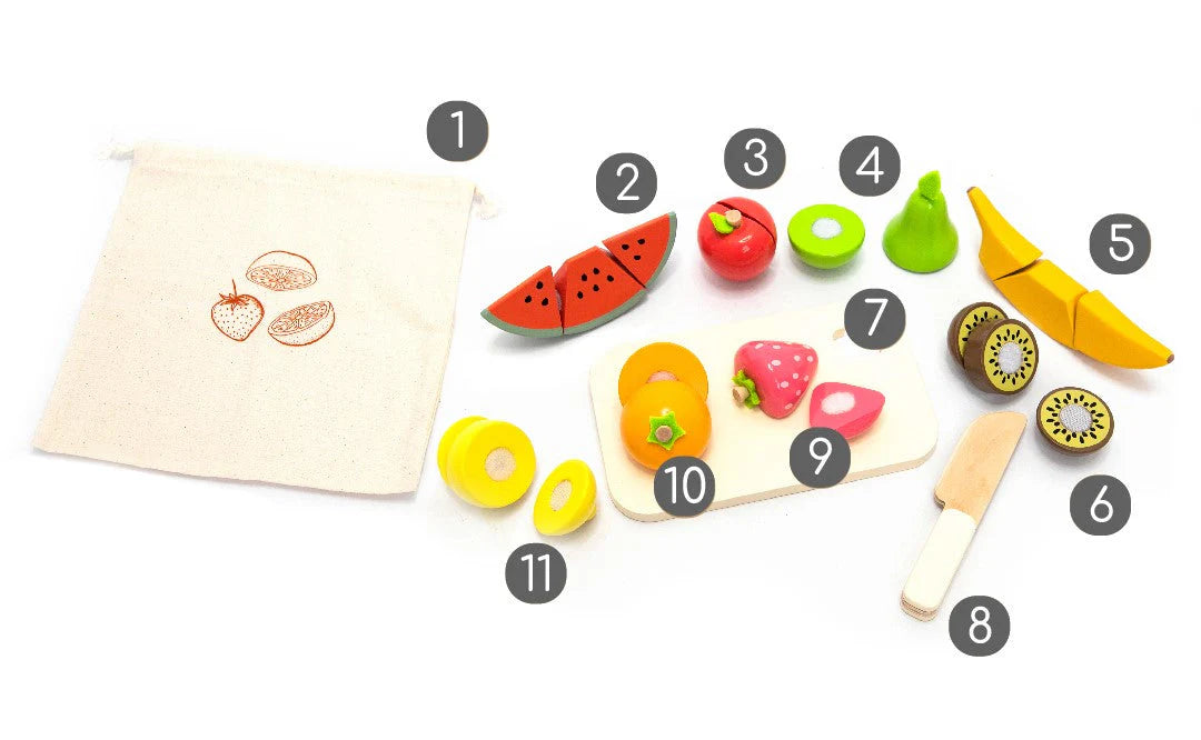 Dieses Holzgemüseschneideset enthält: 1.) Einen Obstbeutel, 2.) Eine Wassermelone, 3.) Einen Apfel, 4.) Eine Birne, 5.) Eine Banane, 6.) Eine Kiwi, 7.) Ein Schneidebrett, 8.) Ein Messer, 9.) Eine Erdbeere, 10.) Eine Orange, 11.) Eine Zitrone