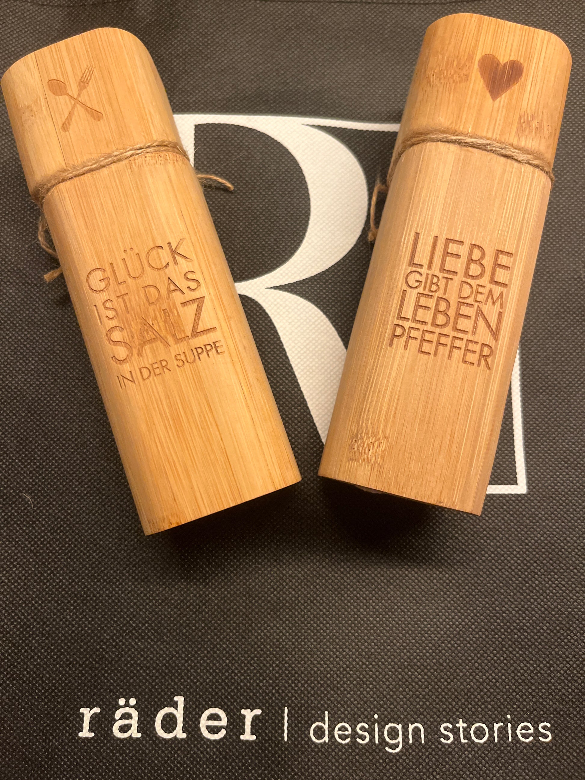 Das hochwertige Salz- und Pfeffermühlen-Set von Räder Design vereint natürliches Holz mit liebevoller Botschaft. Die feinen Gravuren „Glück“ & „Liebe“ machen dieses Set zu einem besonderen Hingucker in jeder Küche und auf jedem Esstisch.